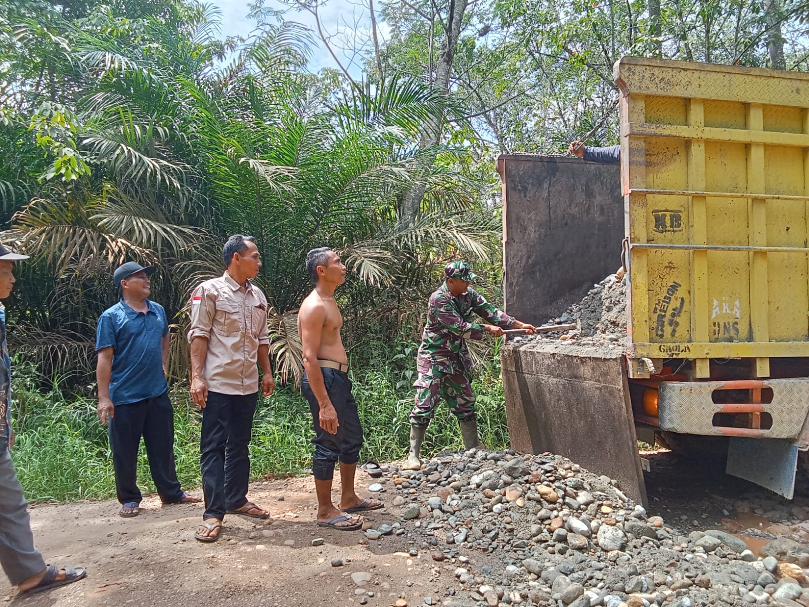 Babinsa Bersama Warga Gotong-royong Timbun Jalan Berlubang di wilayah binaan