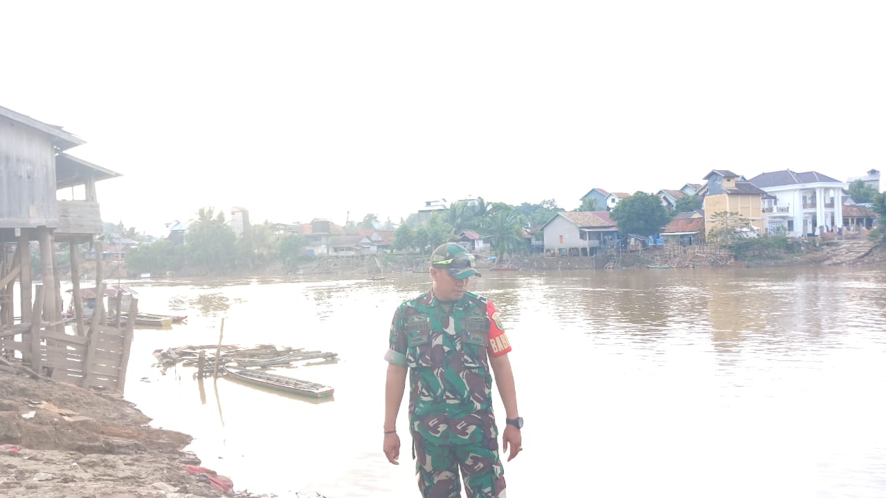 Antisipasi banjir akibat luapan sungai Babinsa melaksanakan monitoring kegiatan Gulbencal pengecekan debit air sungai rawas.