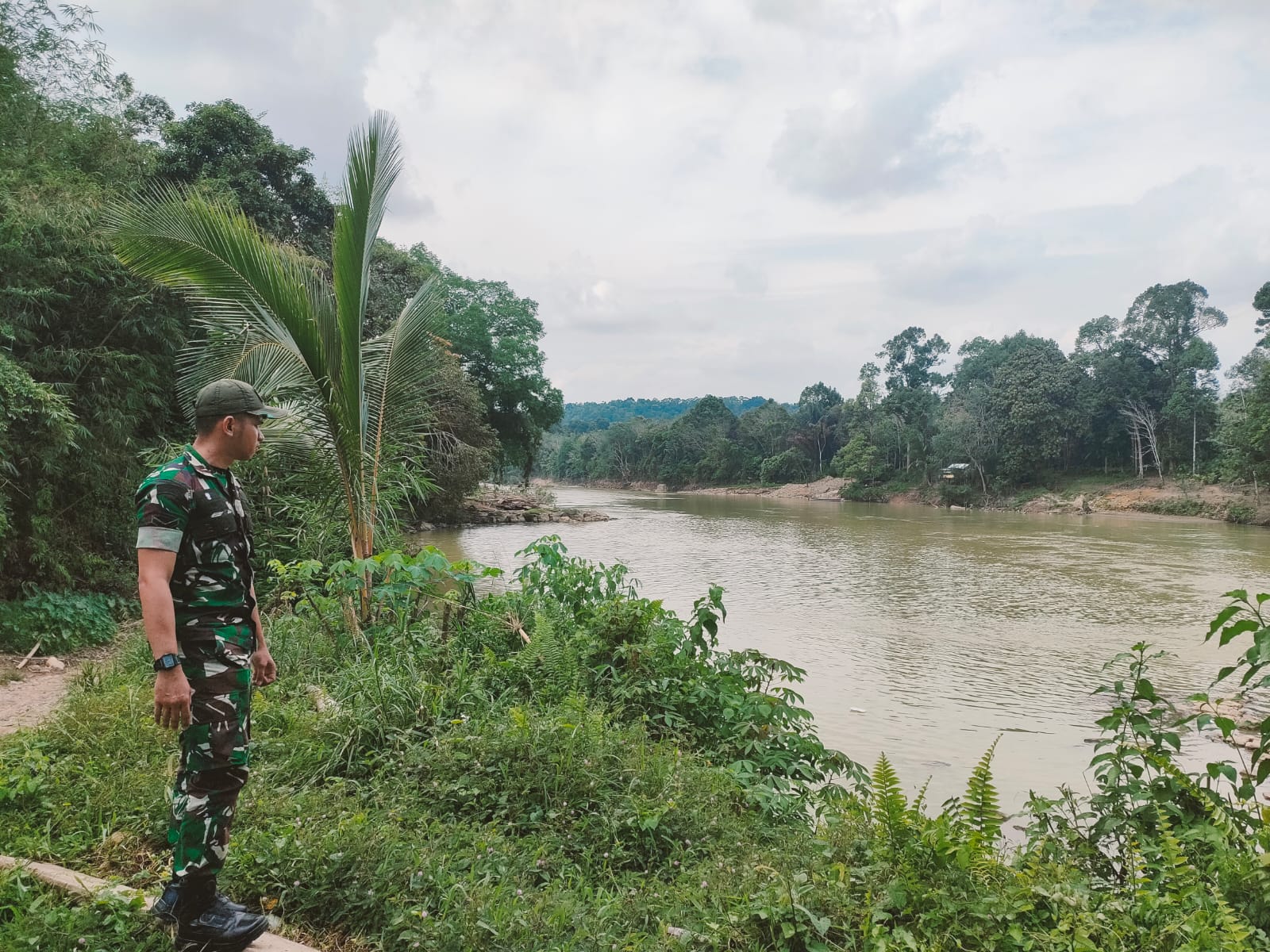 Dengan melaksanakan patroli sekitar tepian sungai dan tempat rawan banjir, Babinsa mengecek debit air di desa binaan Kecamatan rawas ulu.