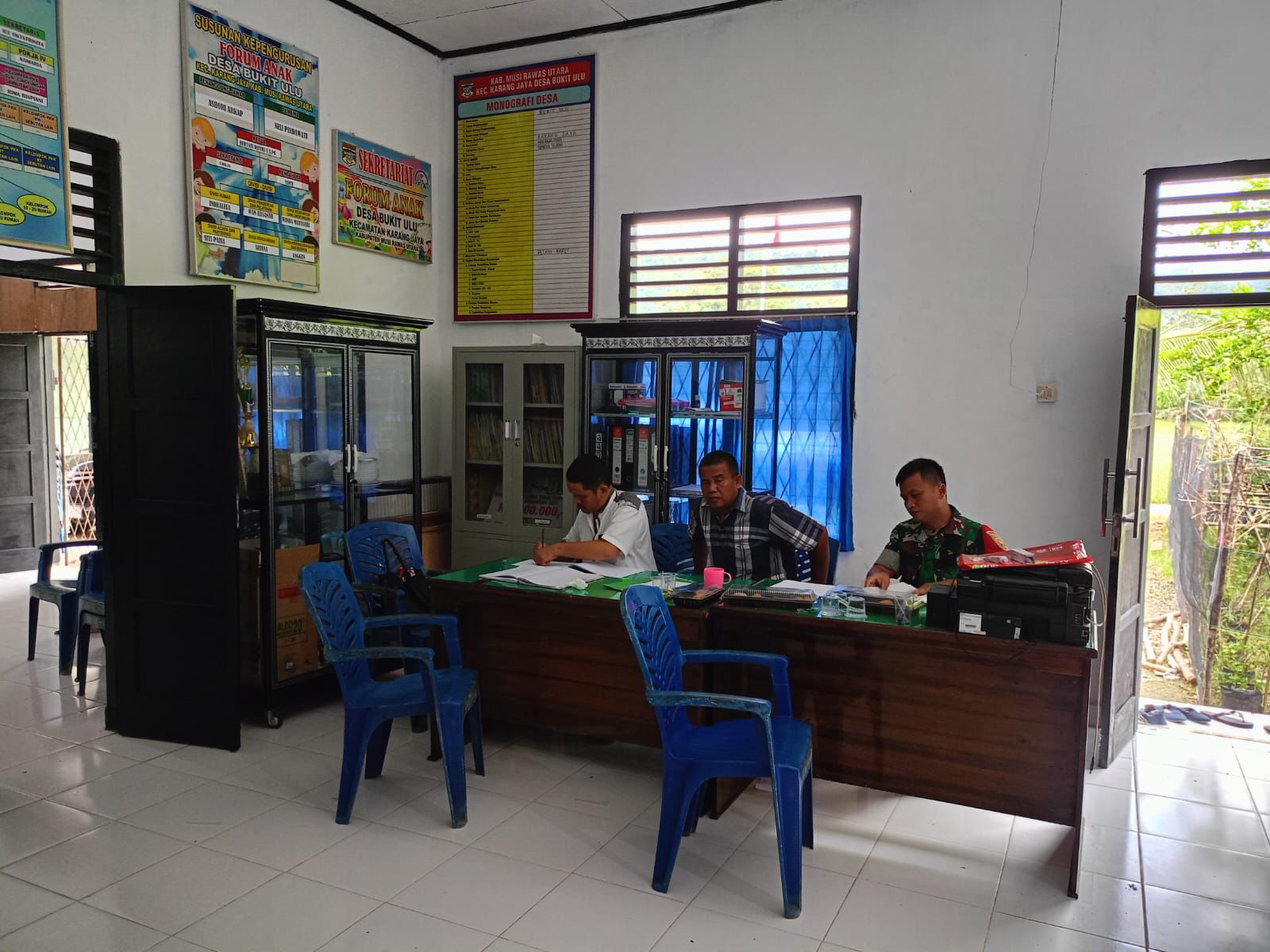 Babinsa melaksanakan kegiatan komsos dan silaturahmi ke kantor Desa Bukit Ulu Tentang Keamanan Dan ketertiban di wilayah desa binaan.