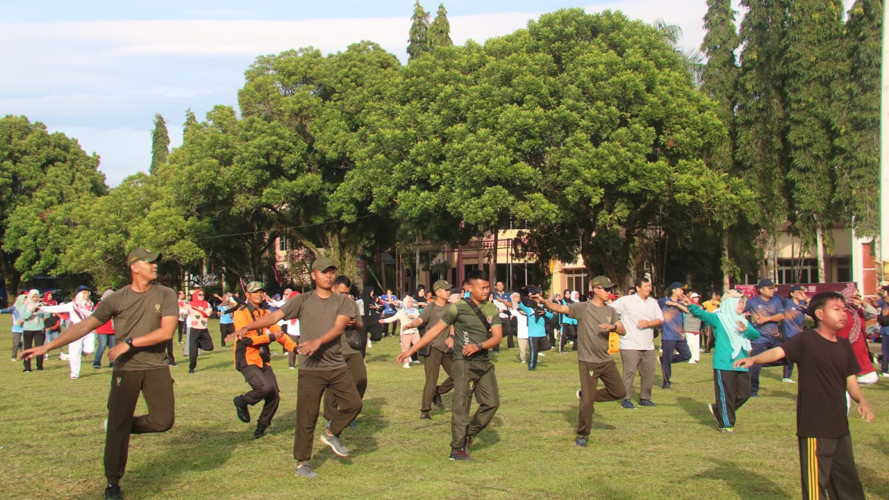 Lensa Garuda- Lubuk Linggau, Personil Kodim 0406 Lubuk Linggau di bawah pimpinan Pasi Ops Kodim 0406/Lubuk Linggau Lettu Inf Ferli Ardiansyah mengikuti senam bersama dan perlombaan di lapangan Kantor Pemerintah Kota(Pemkot) Lubuk Linggau. Jl. Garuda No 10, Kelurahan Kayu Ara, Kecamatan Lubuklinggau Barat I, Kota Lubuk Linggau. Jum’at (09/08/2024).