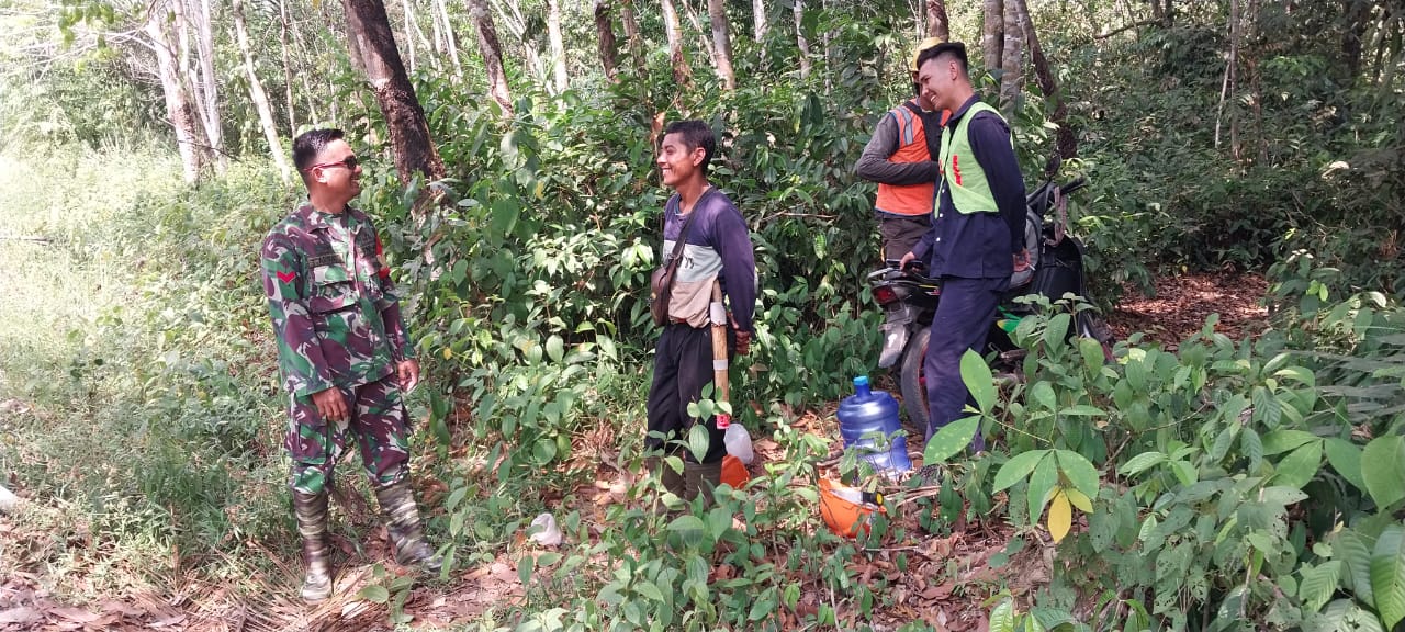 Koptu Tri Ariyanto bersama tiga orang masyarakat setempat melakukan patroli kebakaran hutan dan lahan di Desa Donorejo, Kecamatan Jayaloka, Kabupaten Musi Rawas. Senin (23/09/2024).