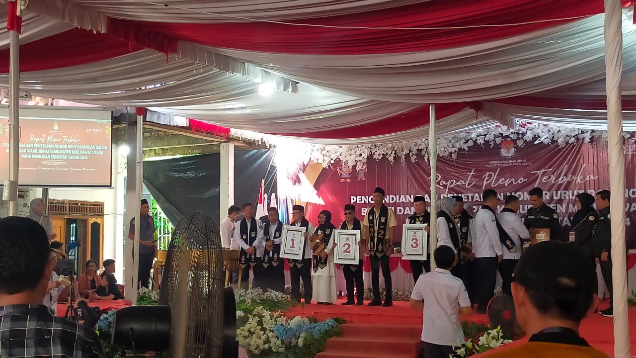 Acara penarikan nomor urut pasangan calon tersebut berlangsung di halaman kantor KPU Kabupaten Muratara, Desa Noman, Kecamatan Rupit, dengan dihadiri oleh para pasangan calon yakni Firsa dan Efriyansah, Devi Suhartoni dan H Junius Wahyudi, serta pasangan calon M Syarif dan Gusti.