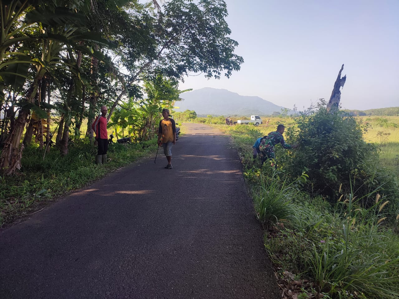 Babinsa Koramil 406-09/Terawas, Sertu Adi Susanto, melaksanakan kegiatan gotong royong bersama masyarakat dan perangkat desa dalam rangka pembersihan jalan di Desa Sumber Karya, Kecamatan STL Ulu Terawas, Kabupaten Musirawas.