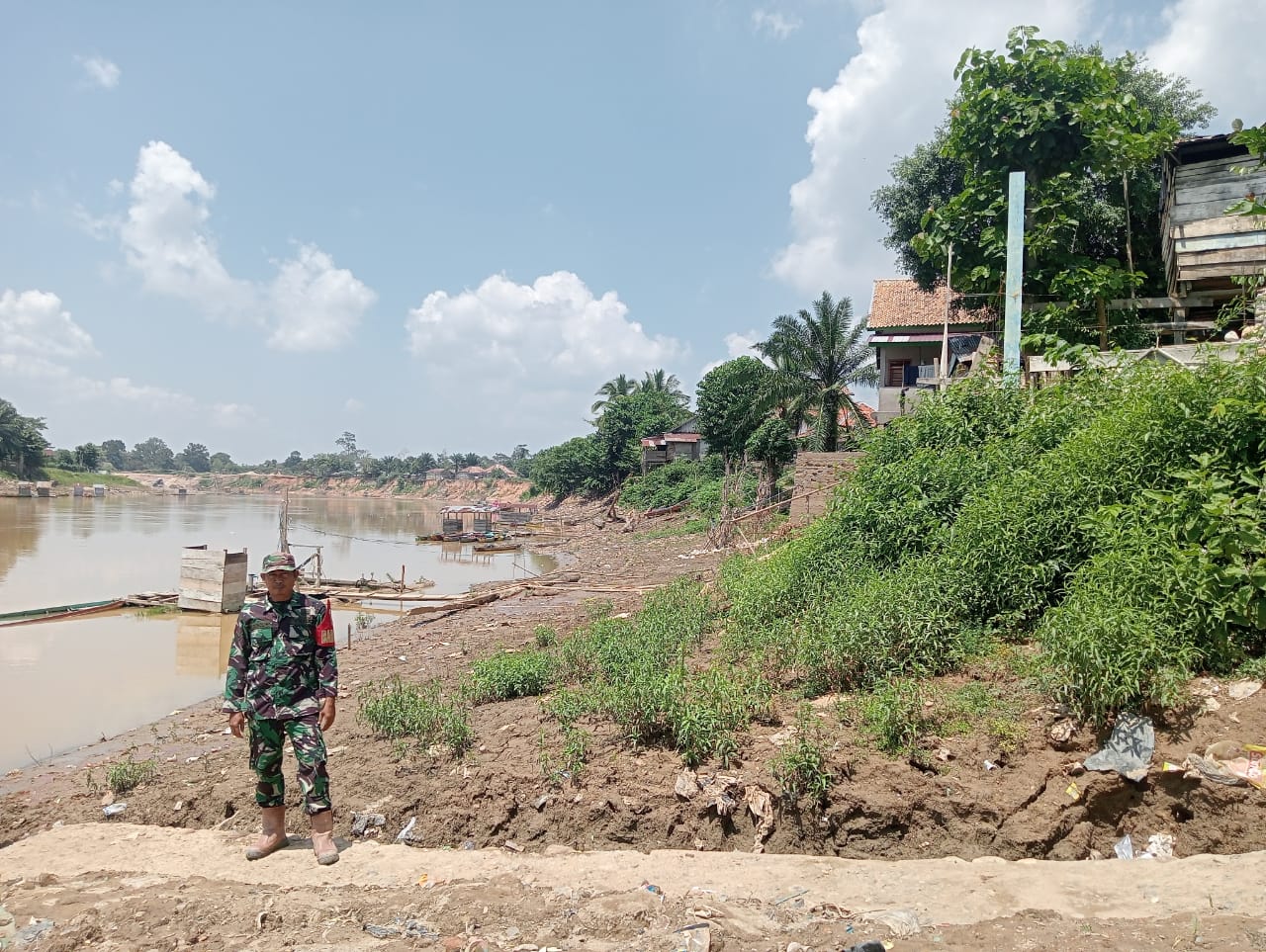 Babinsa Koramil 406-02/Rawas Ilir, Serka Nur Khollis, melaksanakan kegiatan pemantauan arus air Sungai Rawas sebagai bagian dari upaya kesiapsiagaan dan pengendalian bencana (Gulbencal) di Kecamatan Rawas Ilir, Kabupaten Musi Rawas Utara (Muratara).