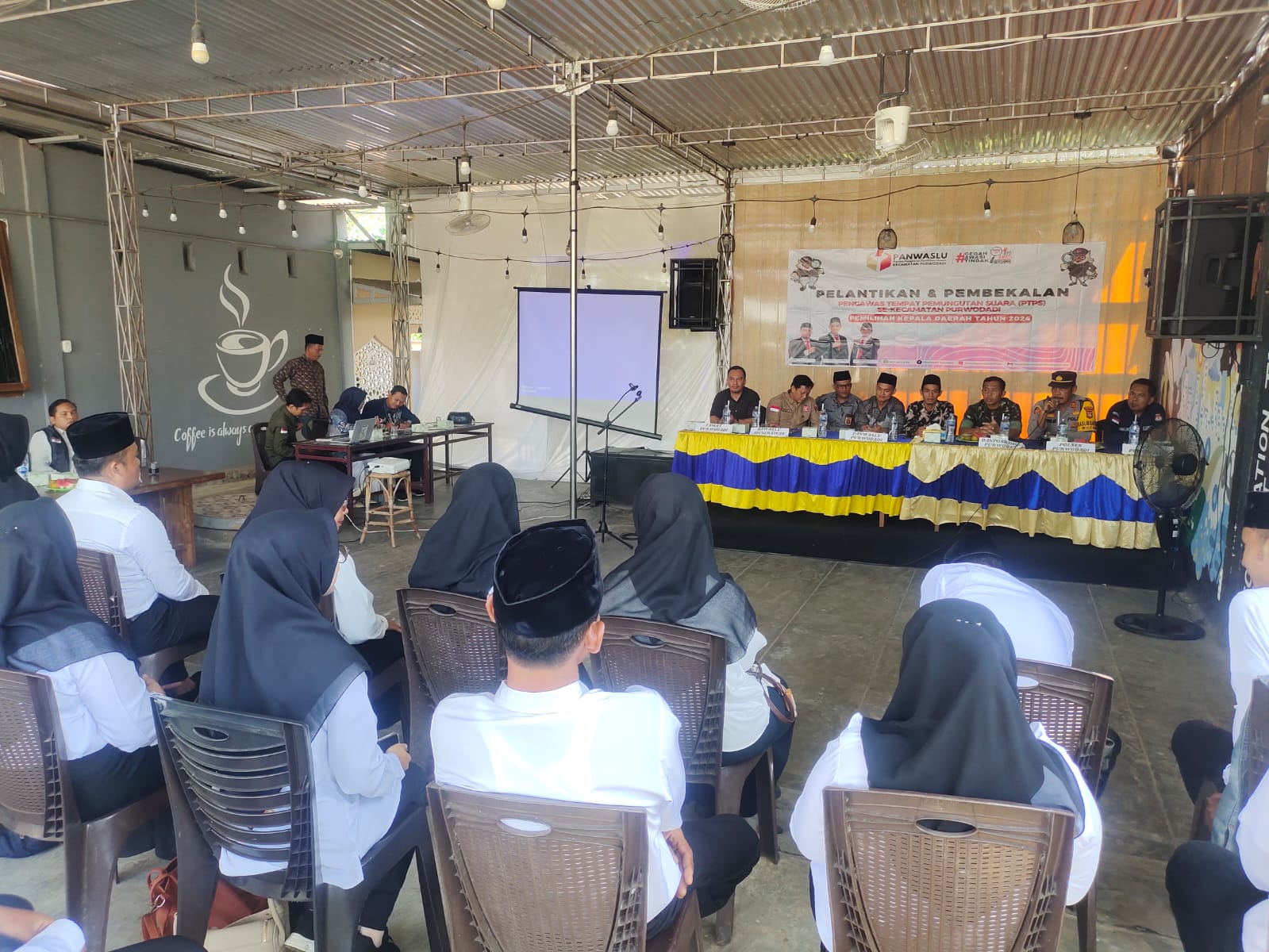 Minggu (03/11/2024), Babinsa Koramil 406-06/Tugumulyo, Peltu Sukardi, menghadiri kegiatan Pelantikan dan Pembekalan Pengawas Tempat Pemungutan Suara (PTPS) di Kecamatan Purwodadi. Acara tersebut berlangsung di Cafe Resto, Desa Kertosari, Kecamatan Purwodadi, Kabupaten Musi Rawas.
