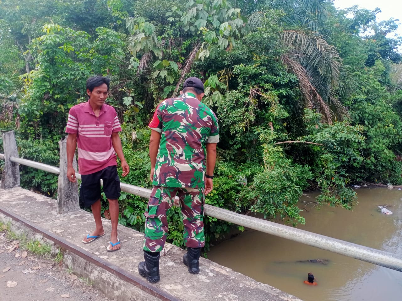 M Daud Babinsa Koramil 406-07/Jayaloka Bersama Mitra Karib Babinsa Pantau Wilayah Rawan Banjir di Sungai Temelat Desa Sukakarya