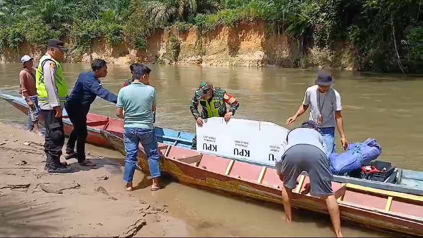 Distribusi logistik Pemilu dilakukan menggunakan dua unit perahu boat untuk menjangkau wilayah yang sulit diakses melalui jalur darat. Proses pengiriman dimulai pada pagi hari dengan pengawalan ketat oleh petugas TNI dan pihak penyelenggara Pemilu untuk memastikan logistik tiba dengan aman di lokasi tujuan.