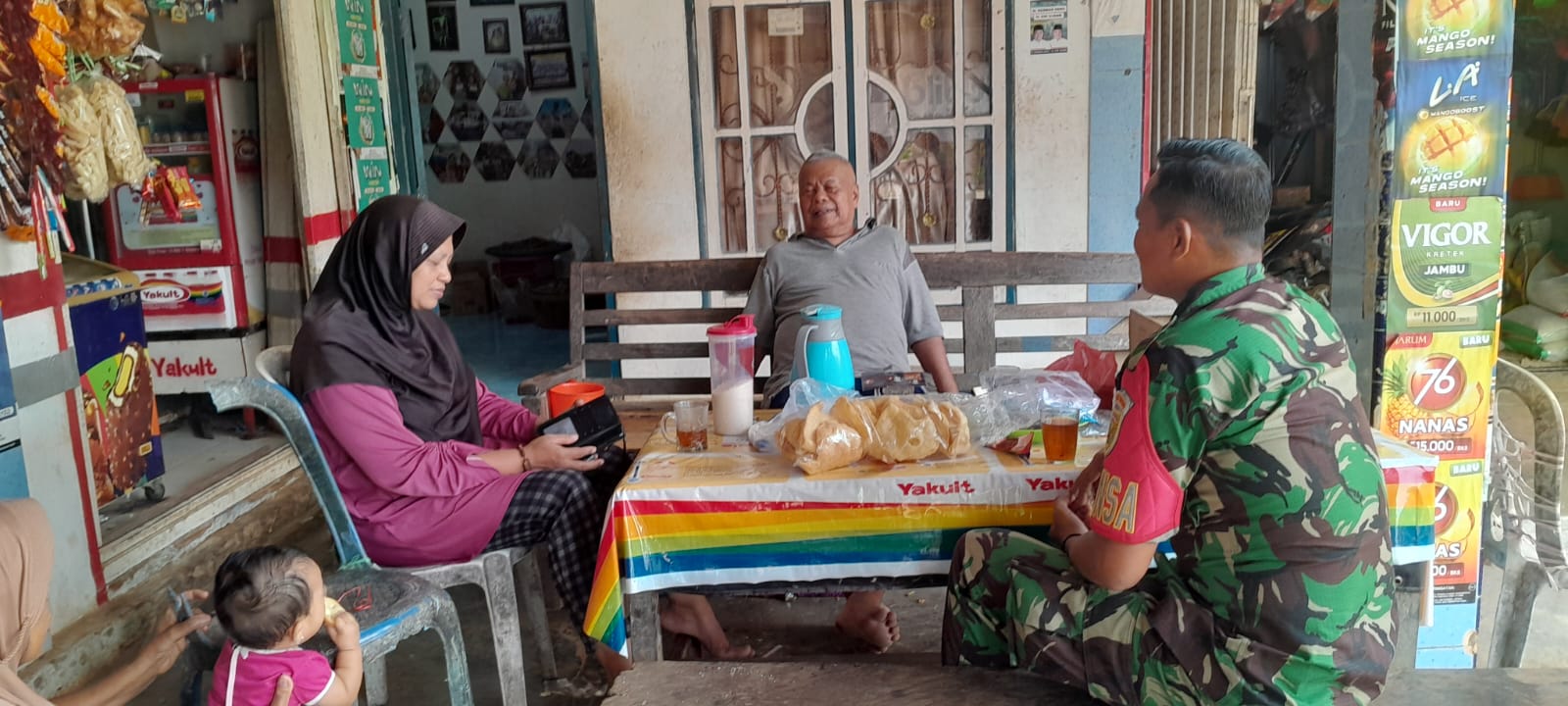 Saat itu, Babinsa sedang membeli rokok di warung tersebut. Melihat peluang yang ada, Babinsa langsung singgah dan duduk bersama dengan Bapak Zulhamjah dan istrinya untuk berbincang-bincang santai. Dalam kesempatan tersebut, Babinsa menyampaikan beberapa pesan positif terkait pentingnya menjaga keamanan dan ketertiban lingkungan, serta mengingatkan warga untuk selalu menjaga kerukunan antar tetangga.