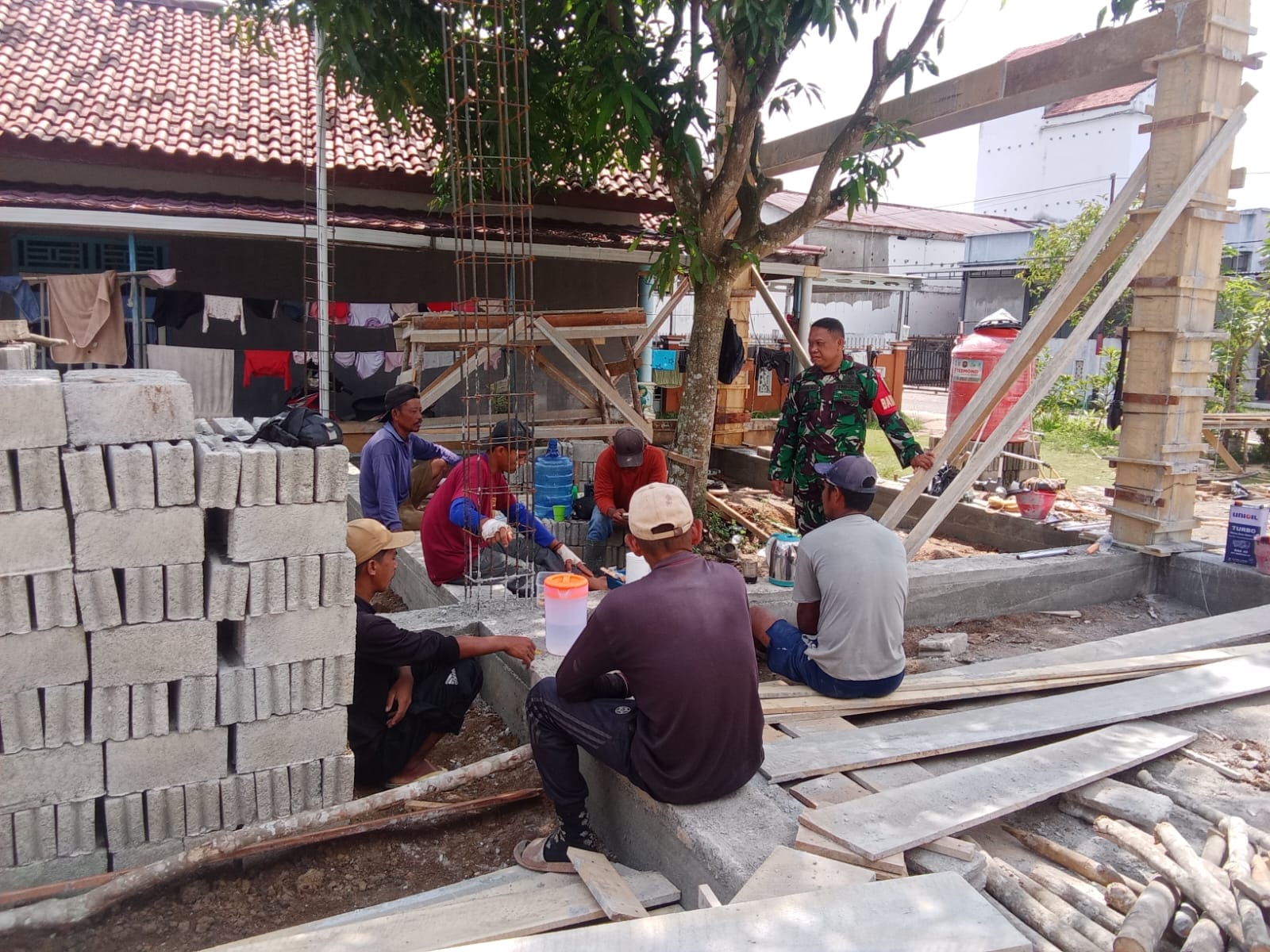Babinsa menyapa para warga yang tengah beristirahat setelah bekerja keras dalam pembangunan rumah mereka. Dalam percakapan yang santai namun penuh makna itu, Babinsa memberikan motivasi kepada warga untuk terus menjaga semangat gotong royong dalam setiap kegiatan pembangunan, baik di lingkungan tempat tinggal maupun di kegiatan sosial lainnya.