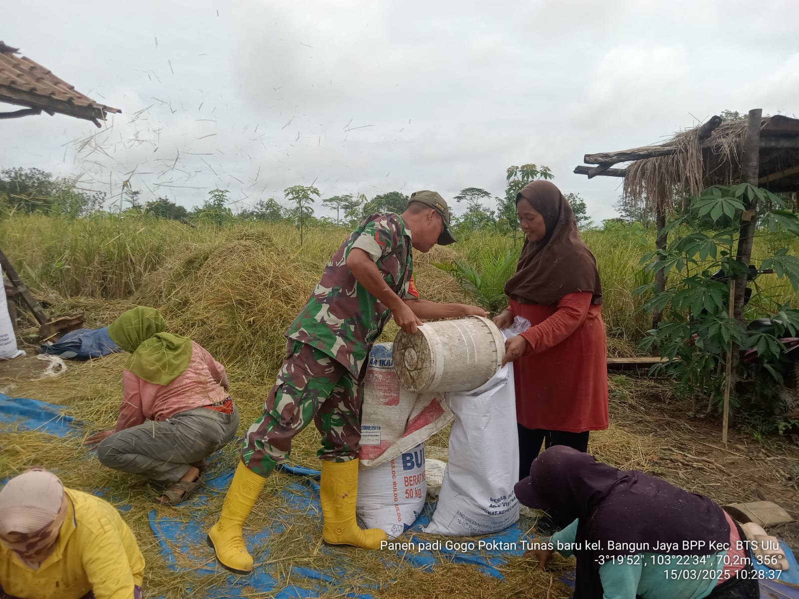 Lensa Garuda- Musi Rawas, Kegiatan pendampingan Babinsa Koramil 406-05/Muara Kelingi Koptu Adim dalam mendukung ketahanan pangan nasional kembali membuahkan hasil. Dalam kesempatan kali ini, Koptu Adim turut serta membantu keluarga Bapak Suradi anggota Poktan Tunas Baru dalam panen padi GOGO jenis Dayang Rindu yang ditanam di lahan seluas 1 hektar di Kelurahan Bangun Jaya , Kecamatan BTS Ulu Kabupaten Musi Rawas. Sabtu (15/03/2025).