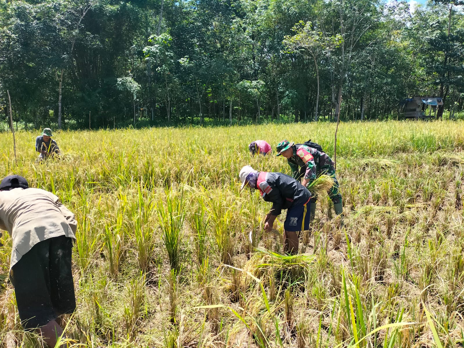 Bintara Pembina Desa (Babinsa) Koramil 406-08/Lubuklinggau, Serda Haeron, melaksanakan kegiatan komunikasi sosial (Komsos) dan pendampingan kepada warga binaan dalam rangka panen padi di Kelurahan Tabah Baru, Kecamatan Lubuklinggau Utara I, Kota Lubuklinggau.