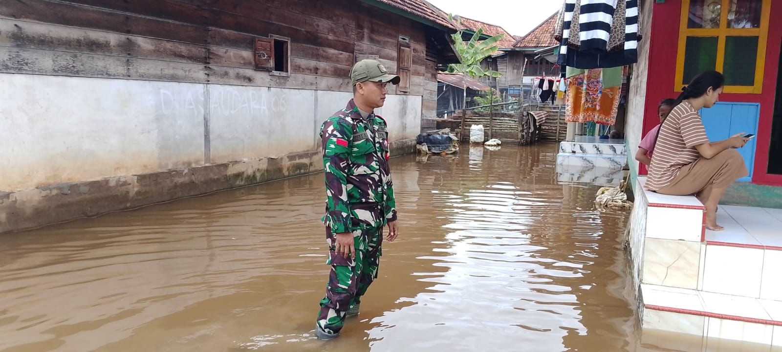Babinsa Koramil 406-02/Rawas Ilir terus melakukan pemantauan perkembangan situasi di wilayah yang terdampak banjir musiman akibat luapan air sungai serta curah hujan yang cukup deras dalam beberapa hari terakhir.