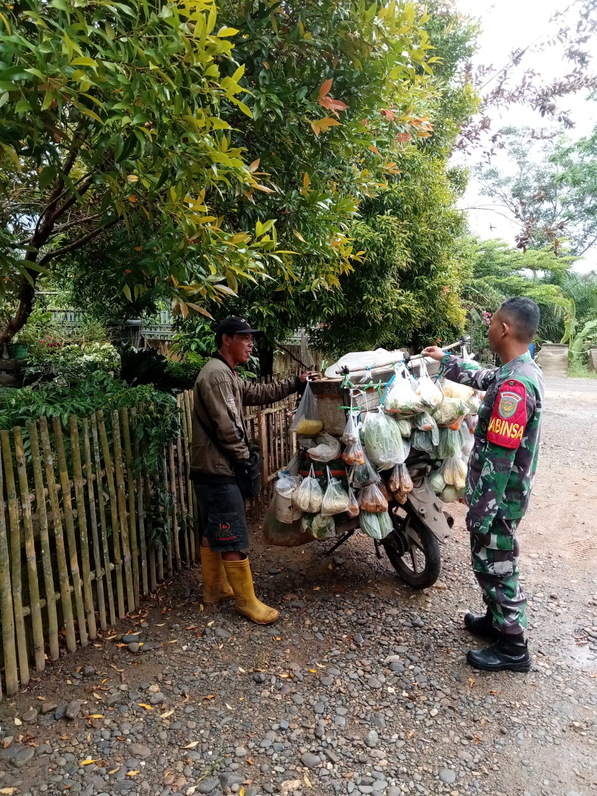 Jayaloka, 25 Maret 2025, Dalam upaya mempererat hubungan dengan masyarakat, Babinsa Koramil 406-07/Jayaloka, Koptu Wasis Suripto, melaksanakan komunikasi sosial (komsos) dengan Bapak Ali, seorang pedagang sayur keliling di Desa Giriyoso, Kecamatan Jayaloka, Kabupaten Musi Rawas, Selasa (25/03/2025).