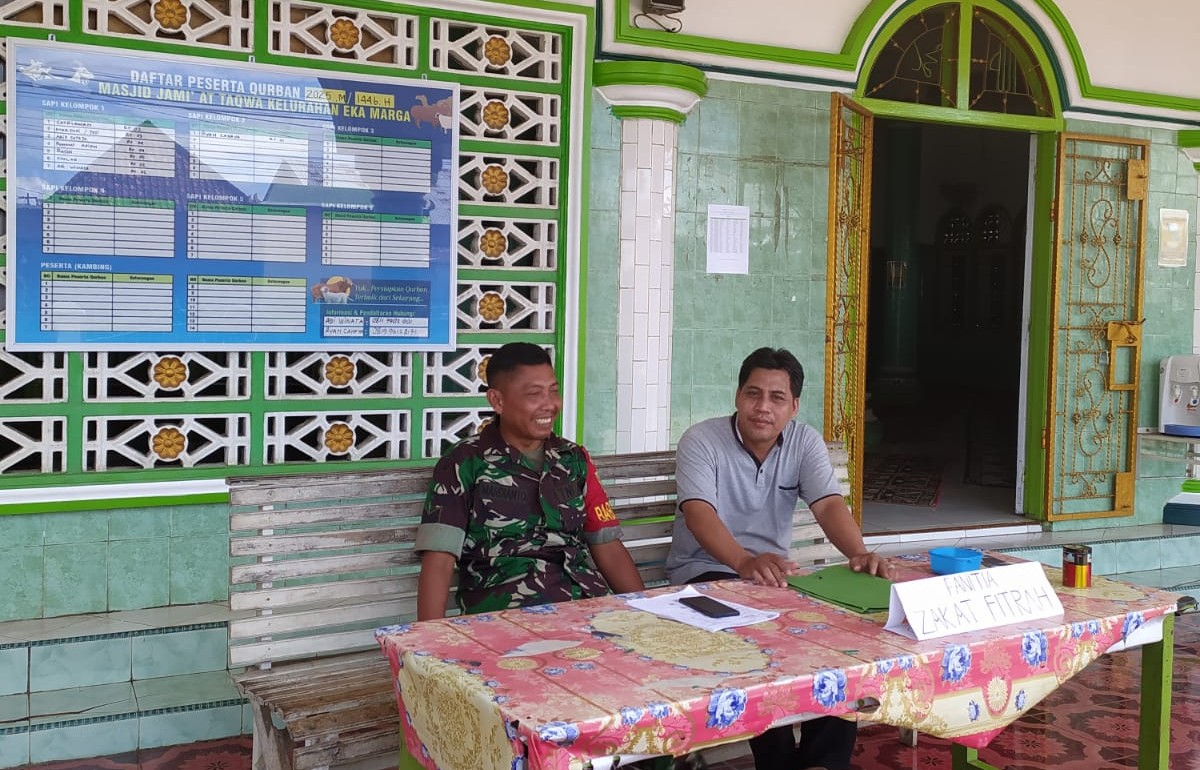 Lensa Garuda- Lubuk Linggau, Serka Mardianto Anggota Koramil 406-10/Lubuk Linggau Timur melaksanakan kegiatan komunikasi sosial (komsos) dengan Ketua RT 02 selaku panitia zakat fitrah di Masjid Jami’ At Taqwa, dalam rangka memastikan kelancaran penyaluran zakat fitrah menjelang Hari Raya Idul Fitri 1446 H. Di Kelurahan Eka Marga, Kecamatan Lubuk Linggau Selatan II. Rabu (26/03/2025).