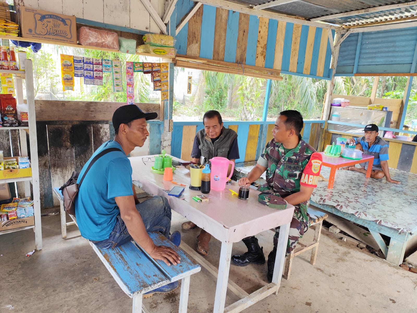 Lensa Garuda- Musi Rawas, Dalam upaya mempererat kemanunggalan TNI dengan rakyat, seorang Bintara Pembina Desa (Babinsa) Serka Ghufron Syadali Koramil 406-05/Muara Kelingi Kodim 0406 Lubuk Linggau melaksanakan kegiatan komunikasi sosial (komsos) dengan warga binaan di sebuah warung kopi dan sarapan. Di Desa Binjai Kecamatan Muara Kelingi Kabupaten Musi Rawas. Kamis (15/05/2025).