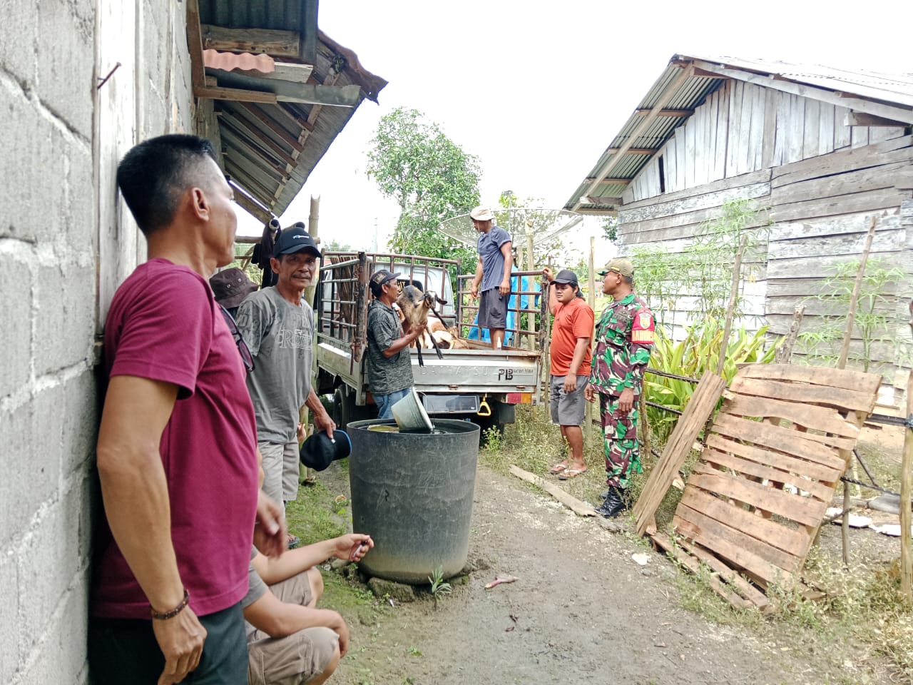 Kades Mangan Jaya Bersama Serka Rudiyanto Babinsa Koramil 406-05/Muara Kelingi Serahkan Bantuan Kambing untuk Dukung Ketahanan Pangan