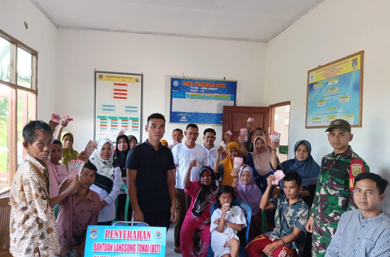 Bintara Pembina Desa (Babinsa) Koramil 406-01/Rawas Ulu, Serda Amrullah Rahim menghadiri kegiatan pembagian Bantuan Langsung Tunai (BLT) yang dilaksanakan di Desa Jangkat, Kecamatan Ulu Rawas, Kabupaten Musi Rawas Utara.