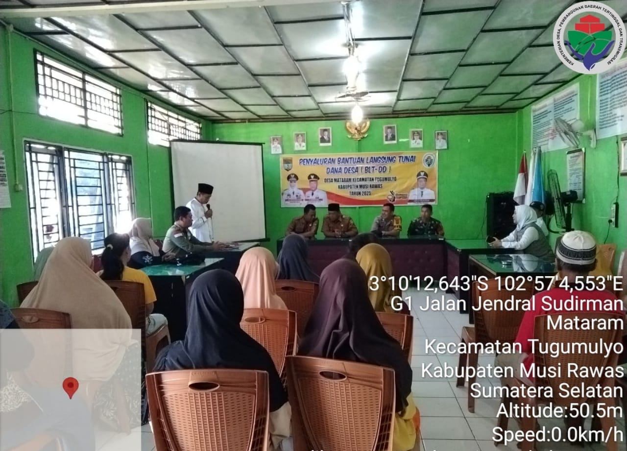 Tugumulyo – Babinsa Koramil 406-06/Tugumulyo, Serka Yongki, menghadiri kegiatan penyaluran Bantuan Langsung Tunai Dana Desa (BLT-DD) serta penetapan titik 100% pembangunan di Desa Mataram, Kecamatan Tugumulyo, Kabupaten Musi Rawas, pada Selasa (10/06/2025).
