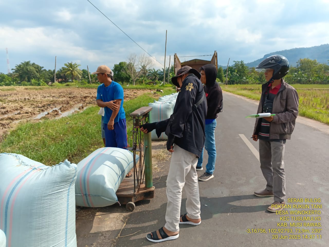 Babinsa Koramil 406-06/Tugumulyo, Sertu Kamsiran, melaksanakan kegiatan pendampingan serapan gabah di Desa Wonokerto, Kecamatan Tugumulyo, Kabupaten Musi Rawas, pada Sabtu (21/06/2025).