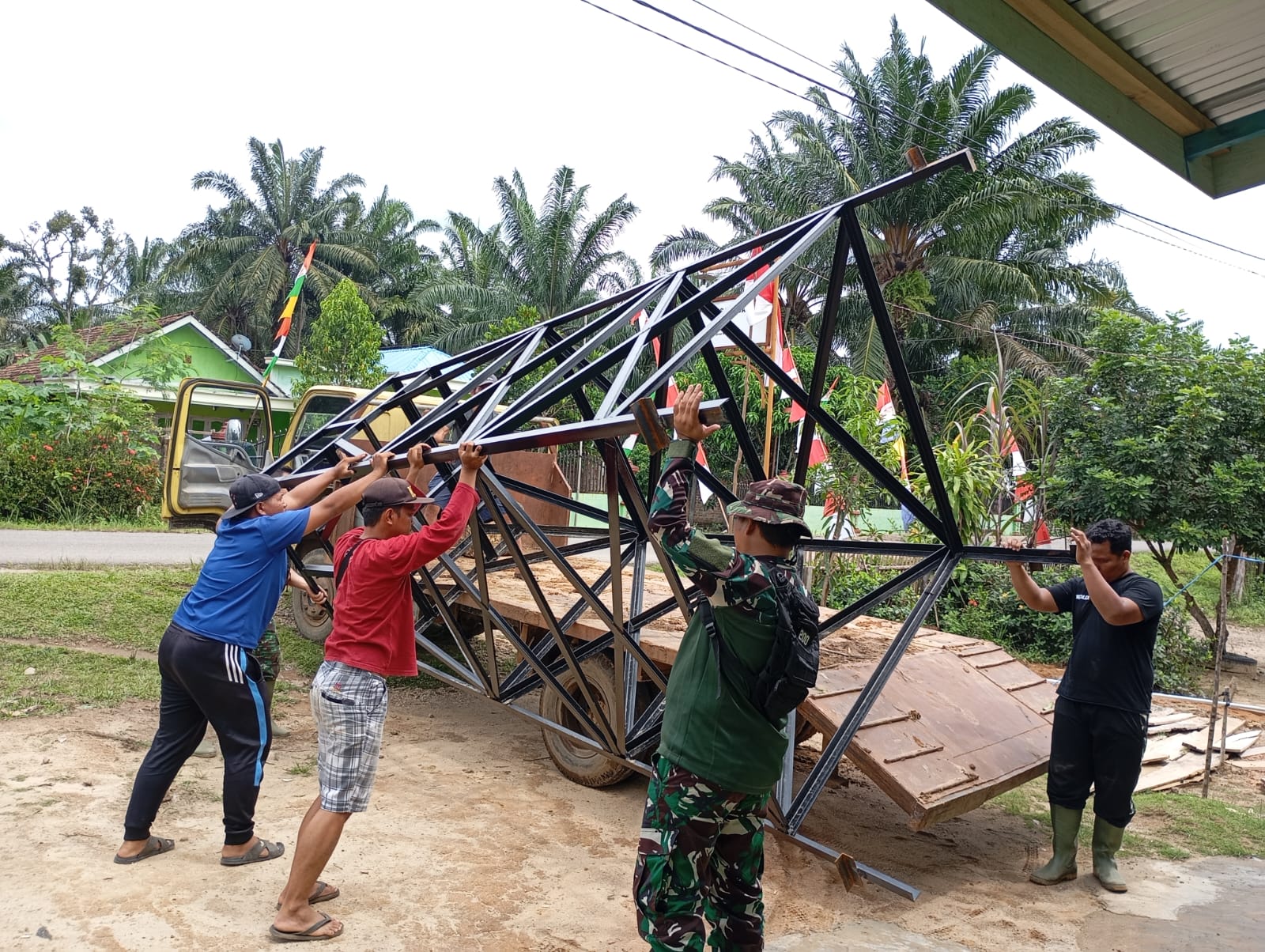 Lensa Garuda-Musi Rawas, Kamis 14 Agustus 2025, Satgas TNI Manunggal Membangun Desa (TMMD) ke-125 Kodim 0406/Lubuklinggau bersama masyarakat Desa Kota Baru SP 7, Kecamatan BTS Ulu, Kabupaten Musi Rawas, menunjukkan semangat gotong royong yang luar biasa dalam kegiatan pemindahan tower air dan tandon air ke titik pengeboran baru.
