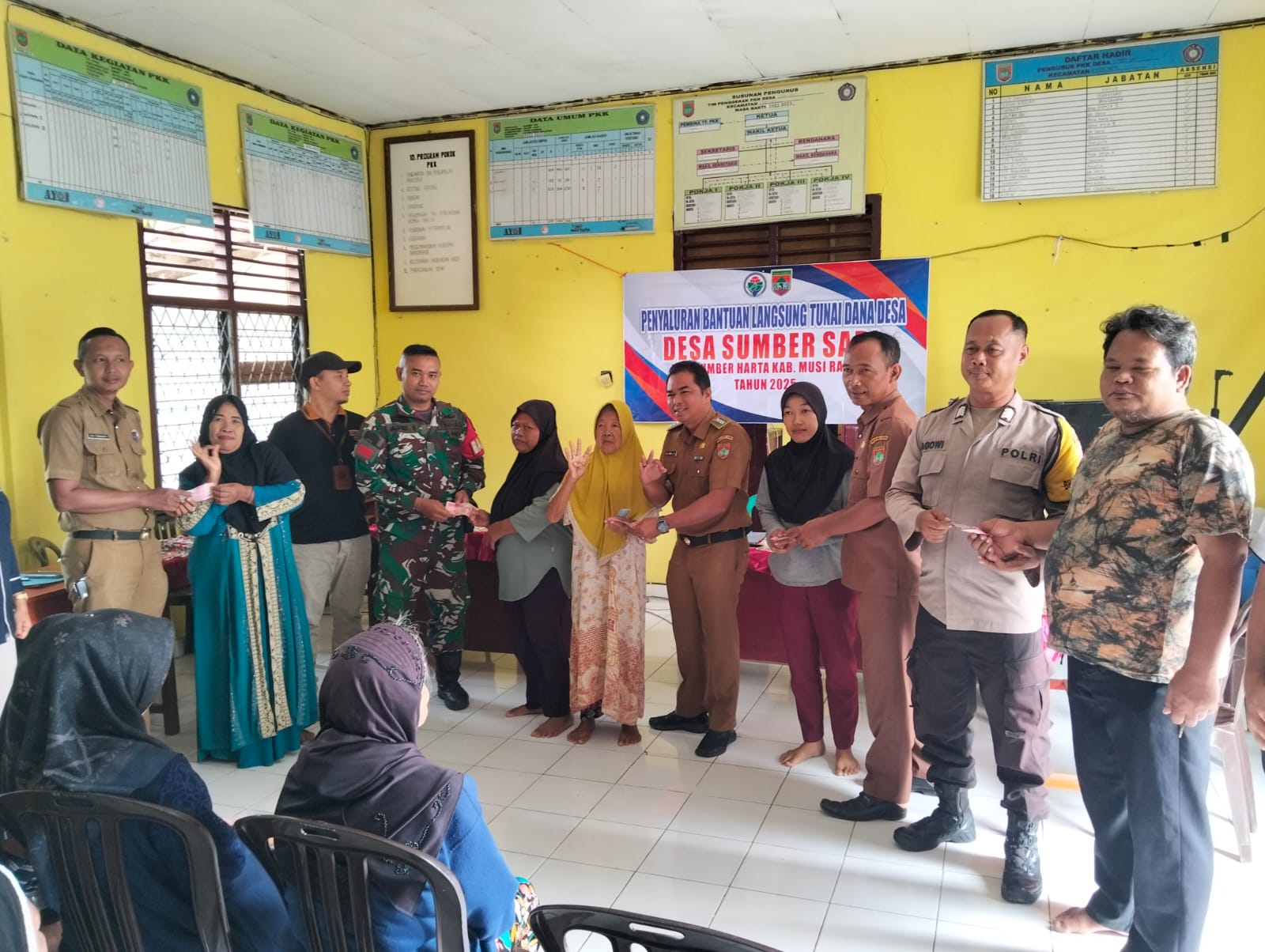 Babinsa Koramil 406-09/Terawas, Praka Jajang, menghadiri undangan kegiatan pembagian Bantuan Langsung Tunai (BLT) sekaligus melaksanakan pengecekan titik 0% pembangunan di Kantor Desa Sumbersari, Kecamatan Sumber Harta, Kabupaten Musi Rawas.