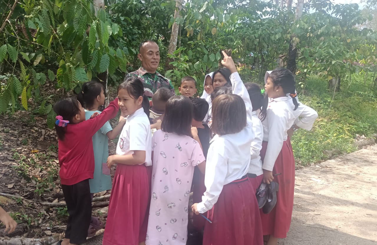 Babinsa Koramil 406-09/Terawas, Serka Bambang melaksanakan kegiatan komunikasi sosial (Komsos) dengan memberikan motivasi kepada anak-anak siswa SD di wilayah Kecamatan Sumber Harta, Kabupaten Musi Rawas,