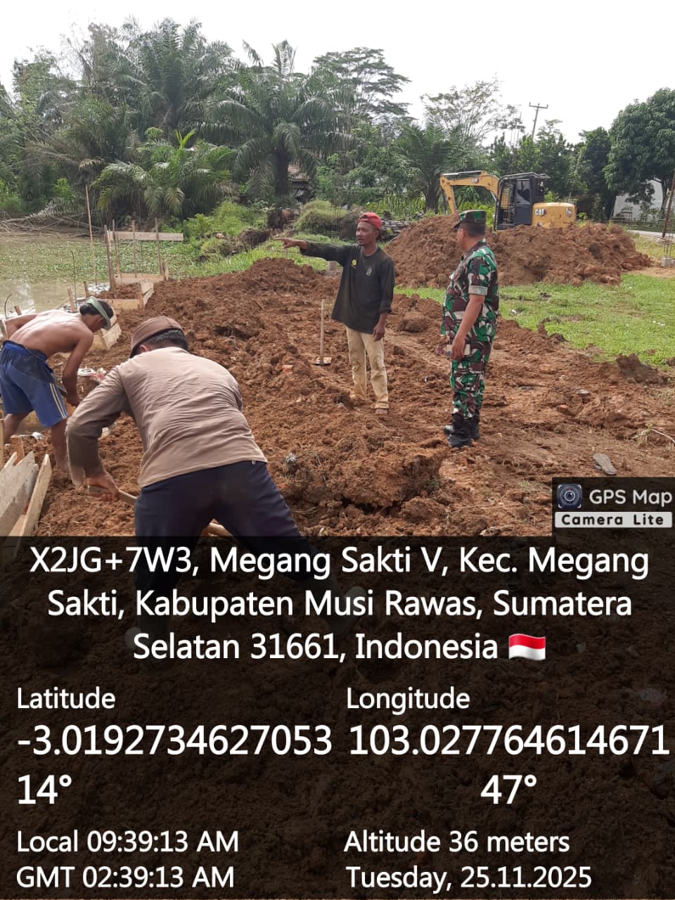 Muara Lakitan, Danramil 406-04/Muara Lakitan, Kapten Inf Hendri Susanto, melaksanakan pemantauan langsung terhadap proses pembangunan Kawasan Desa Kreatif Mandiri Produktif (KDKMP) di Desa Megang Sakti V, wilayah binaan Koramil 406-04/Muara Lakitan, Selasa (25/11/2025).