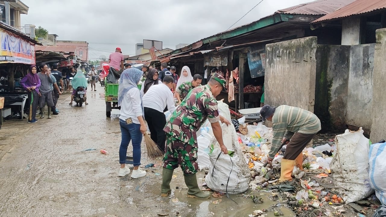 Danramil 406-04/Muara Lakitan, Kapten Inf Hendri Susanto, memimpin langsung kegiatan pembersihan (karya bakti/kope) di Pasar Mega Sakti, Kecamatan Megang Sakti, Kabupaten Musi Rawas, pada Jum’at, 06 Februari 2026.